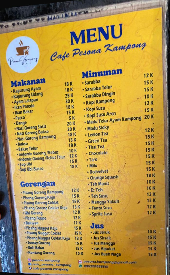 Cafe Pesona Kampong merupakan salah satu tempat nongkrong yang berada di kawasan Kambo, Kota Palopo. Kafe ini dikenal dengan konsep bernuansa alam dan pedesaan yang menghadirkan suasana tenang serta udara yang sejuk khas daerah perbukitan. Mengusung konsep tradisional, Cafe Pesona Kampong menawarkan pengalaman bersantai yang nyaman dengan pemandangan alam yang indah. Lokasinya yang berada di dataran tinggi membuat pengunjung dapat menikmati panorama Kota Palopo dari kejauhan, terutama saat sore hingga malam hari.Tempat ini cocok untuk bersantai bersama keluarga, teman, maupun pasangan. Selain suasananya yang nyaman, Cafe Pesona Kampong juga menyediakan berbagai pilihan makanan dan minuman, mulai dari hidangan ringan hingga minuman hangat dan kekinian. Secara keseluruhan, Cafe Pesona Kampong menjadi salah satu destinasi kuliner yang memadukan keindahan alam, suasana pedesaan, dan kenyamanan dalam satu tempat, sehingga banyak diminati oleh masyarakat maupun wisatawan yang berkunjung ke Kota Palopo.